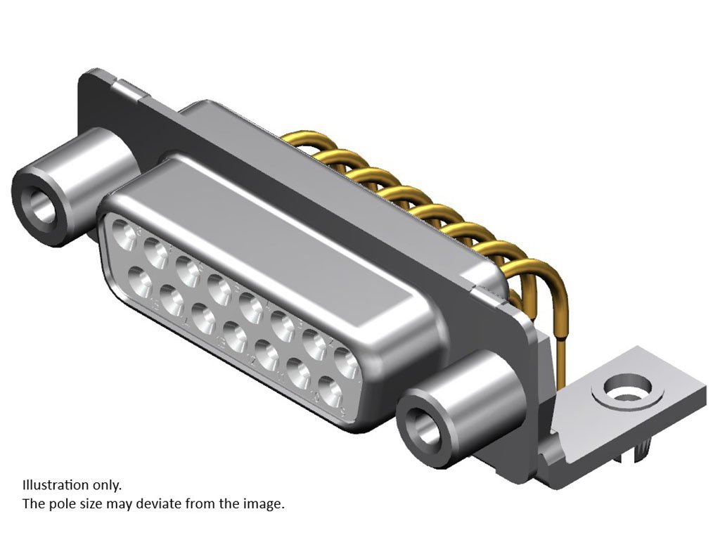 FCT Standard-Density D-Sub Connector, Female, Right-Angle, PCB Through Hole, 11.10mm Tail Length, Gold Plating, 200 Mating Cycles, Riveted Metal Bracket and Threaded Spacer, 9 Circuits, White Insulator