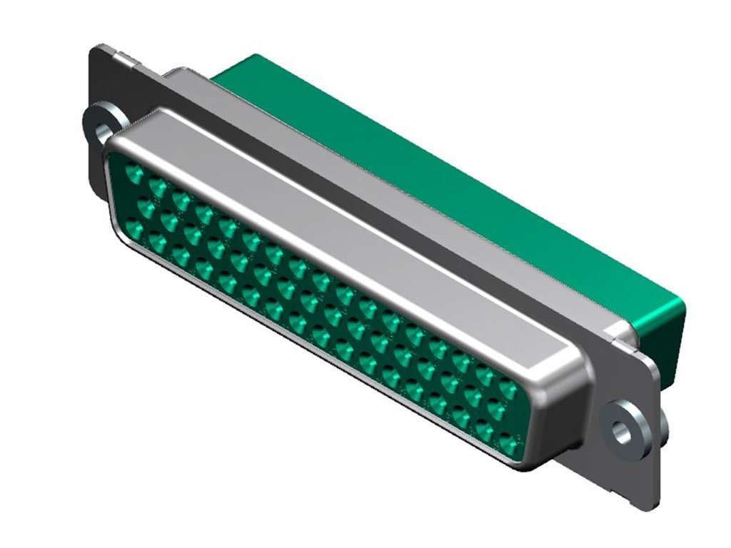 FCT Standard-Density D-Sub Crimp Housing, Female, Shell without Dimples, Float Mount, 50 Circuits, Green Front and Rear Insulator, Crimp Contacts Included