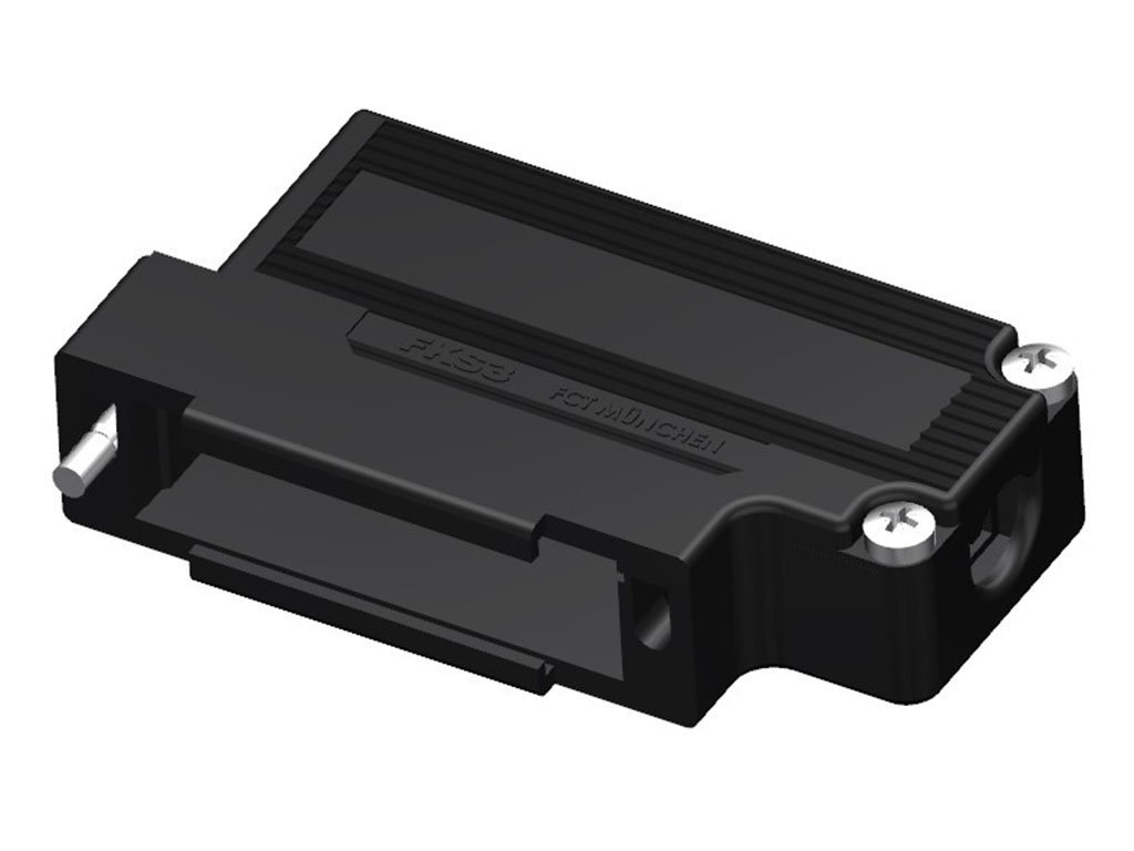 FCT Plastic Backshell for D-Sub Connector, Black, Shell Size 3, 90° Angle Cable Outlet, Low Body, with #4-40 Locking Screws, Individually Packed