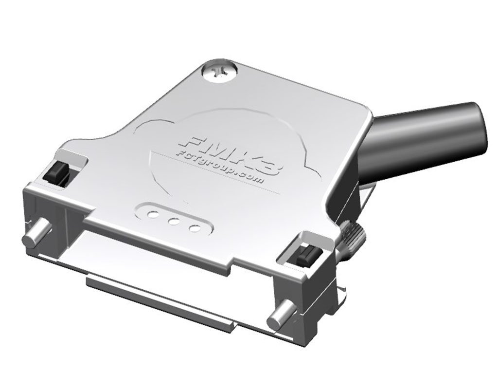 FCT Metal Backshell for D-Sub Connector, Shell Size 3, 45° Angle Cable Outlet, Large Inner Chamber, with Rubber Bushing and #4-40 Knurled Thumb Screws