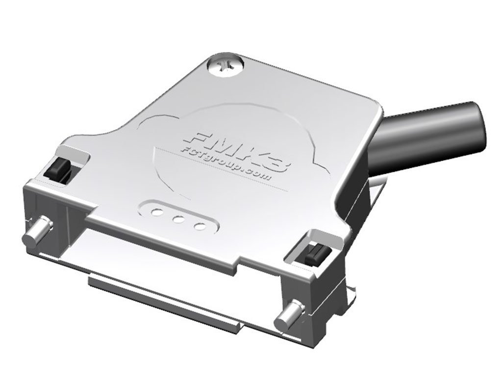 FCT Metal Backshell for D-Sub Connector, Shell Size 3, 45° Angle Cable Outlet, Large Inner Chamber, with Rubber Bushing, #4-40 Locking Screws, and Insulating Foil