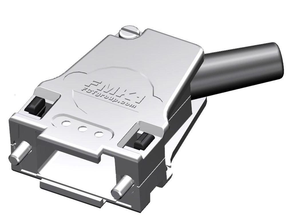 FCT Metal Backshell for D-Sub Connector, Shell Size 1, 45° Angle Cable Outlet, Large Inner Chamber, Non-magnetic, with Rubber Bushing and #4-40 Locking Screws,