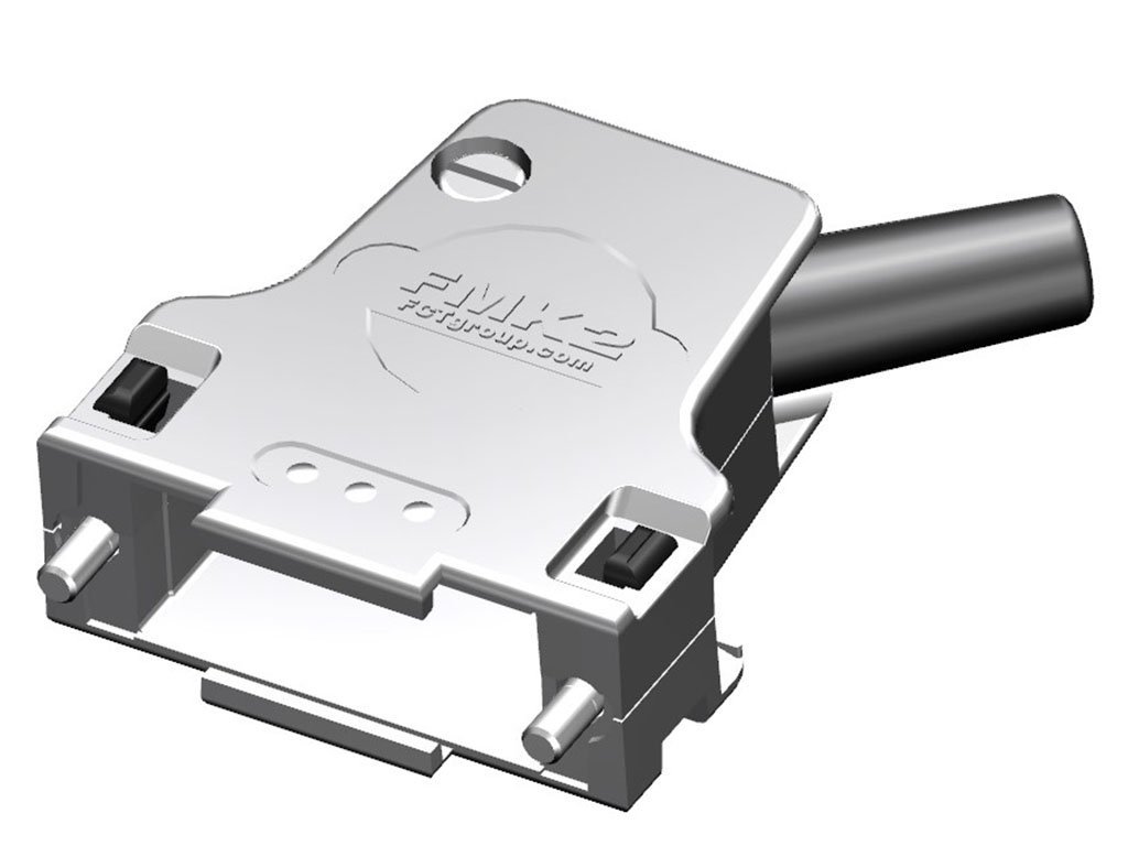 FCT Metal Backshell for D-Sub Connector, Shell Size 2, 45° Angle Cable Outlet, Large Inner Chamber, Non-magnetic, with Rubber Bushing and #4-40 Locking Screws