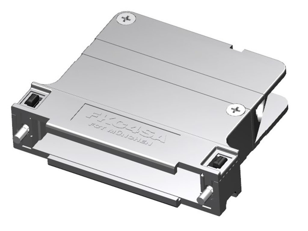 FCT Plastic Backshell for D-Sub Connector, Shielded, Shell Size 4, 70° Angle Cable Outlet, Large Inner Chamber, 16.30mm Width, with #4-40 Locking Screws, Individually Packed