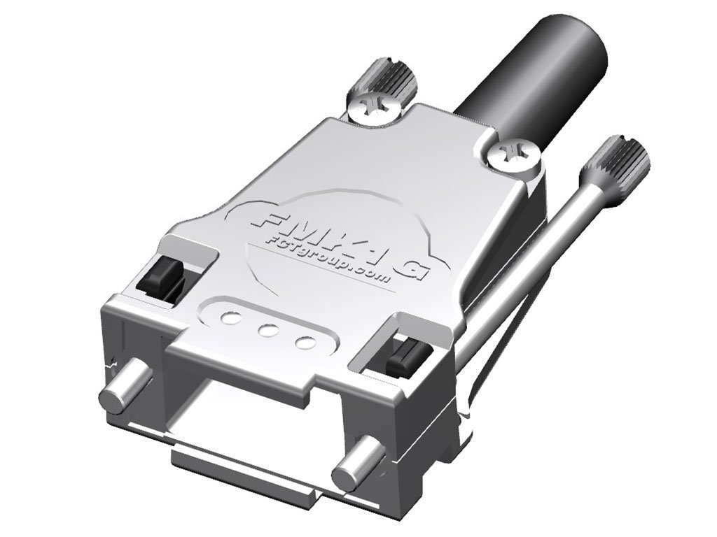FCT Metal Backshell for D-Sub Connector, Shell Size 1, Straight Cable Outlet, Large Inner Chamber, with Rubber Bushing and M3 Knurled Thumb Screws