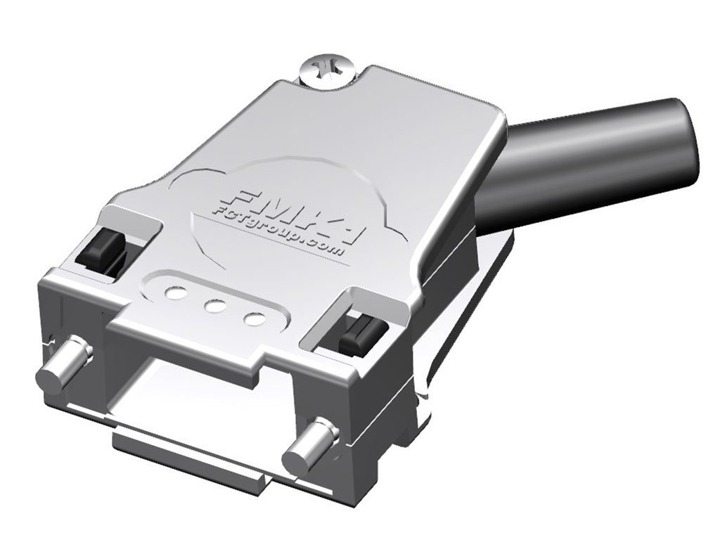 FCT Metal Backshell for D-Sub Connector, Shell Size 1, 45° Angle Cable Outlet, Large Inner Chamber, with Rubber Bushing and #4-40 Locking Screws, Hood Snapped Together