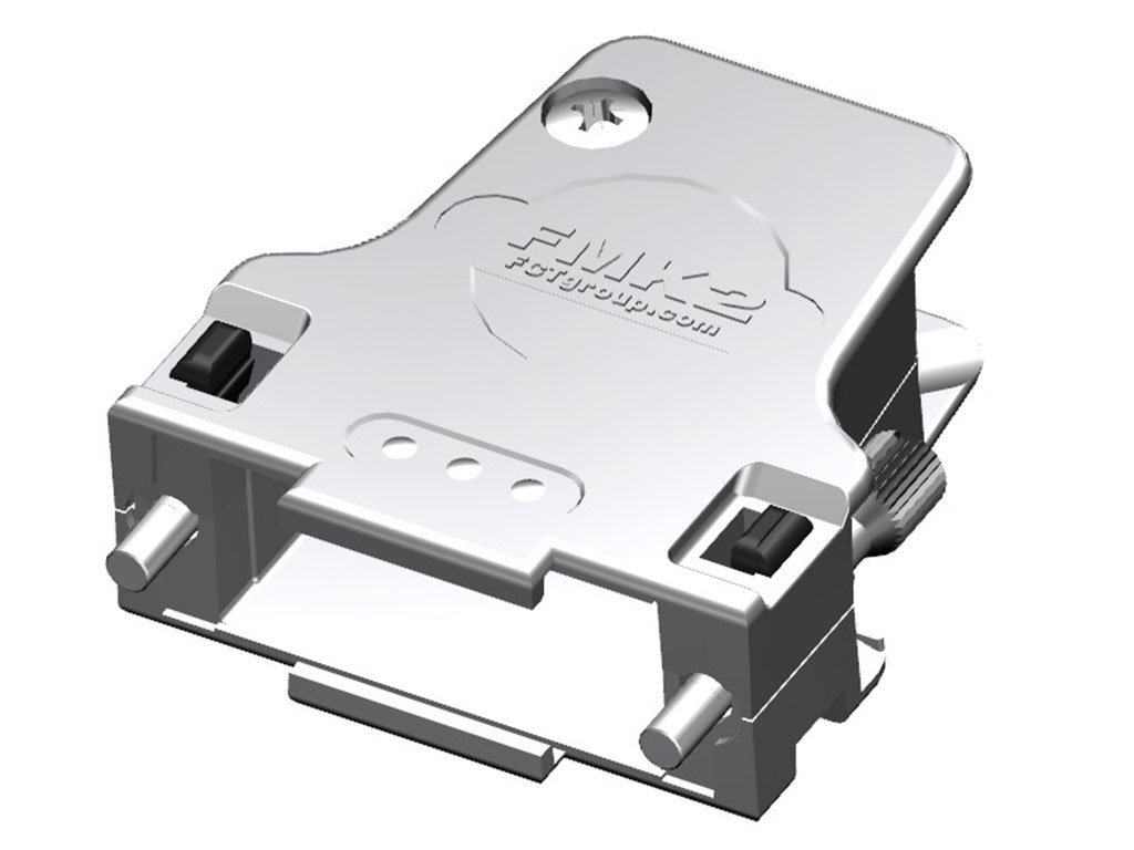 FCT Metal Backshell for D-Sub Connector, Shell Size 2, 45° Angle Cable Outlet, Large Inner Chamber, with #4-40 Knurled Thumb Screws