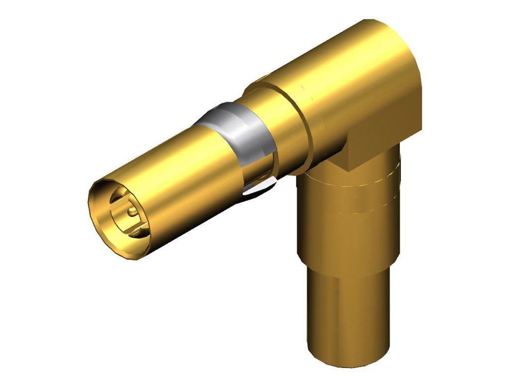 FCT DIN Coaxial Contact, Female, Right-Angle, Solder Cable Termination, 50 Ohms, 1.30µm Gold Plating, for RG-316U Double Shielded Cable