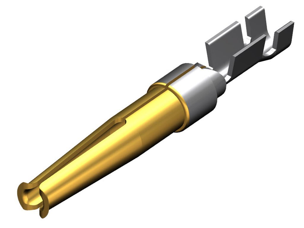 FCT Stamped Contact, Female, Crimp, 0.80µm Gold Mating Plating, Split Tine, 24-28 AWG, 10,000 pieces on reel – Left Side Entry with Turnaround