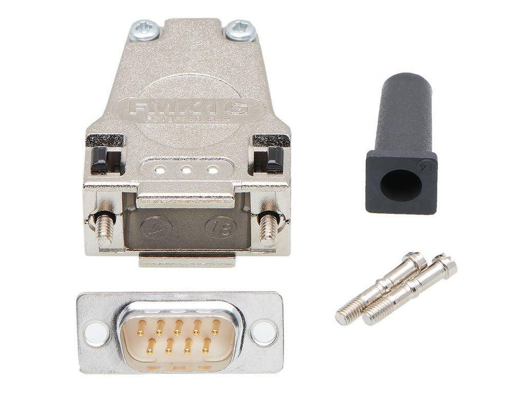 FCT Backshell Connector Kit, Metal Backshell, Male Standard Density D-Sub Connector, Solder Cup Signal Contacts, 9 Circuits, Straight Cable Outlet