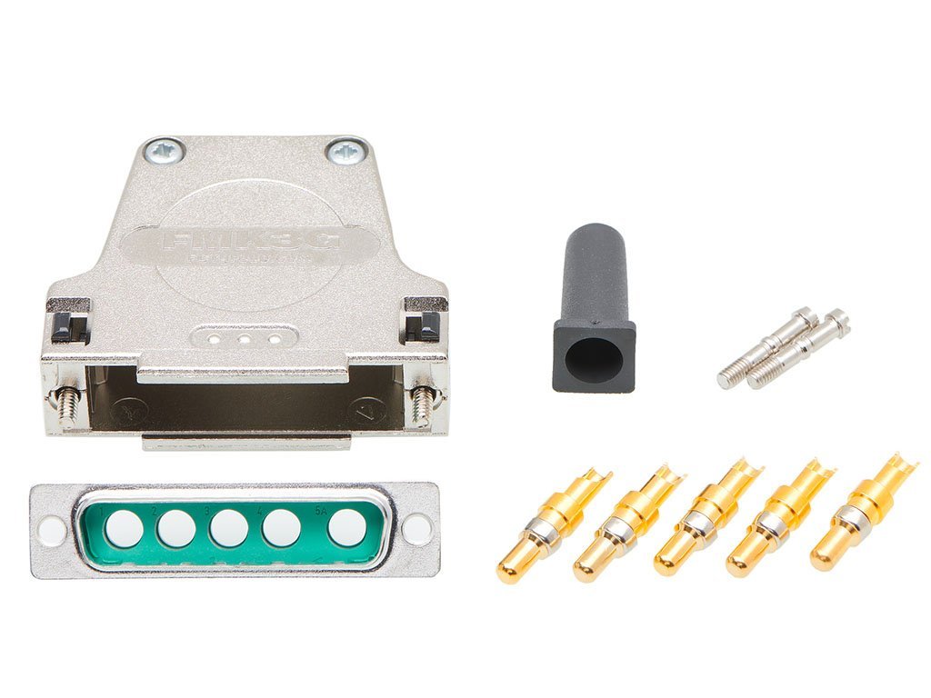 FCT Backshell Connector Kit, Metal Backshell, Male Mixed Layout D-Sub Connector, High Power Solder Cup Contacts, 5 Circuits, Straight Cable Outlet