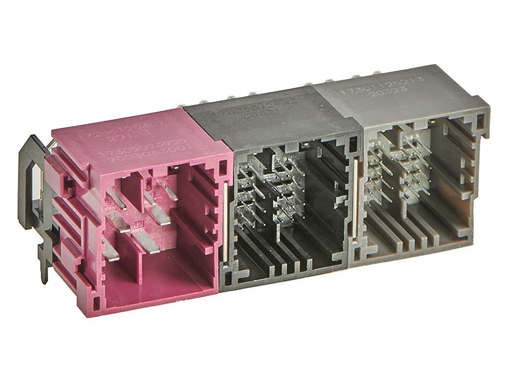 stAK50h 3 Bay Right-Angle Hybrid Header, 76 Circuits, Bay 1: 12 Circuits/Key 3/Purple; Bay 2: 32 Circuits/Key 1/Black; Bay 3: 32 Circuits/Key 3/Dark Gray; Tray
