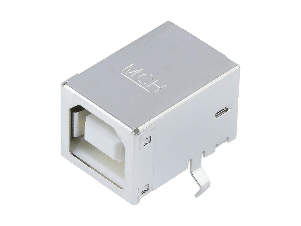 Universal Serial Bus (USB) Shielded I/O Type B Receptacle, Right-Angle, with Kinked Solder Tabs, Color White, 0.76µm Gold (Au)Plating, Tray Pack, Lead-Free
