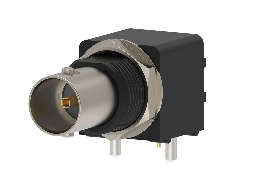 BNC Jack, Right-Angle, PCB Receptacle, Black PBT Housing, Tray, 75 Ohms