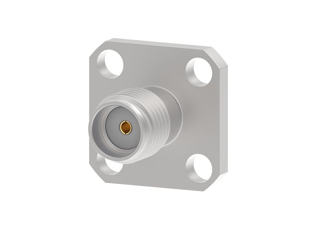 50 Ohms, SMA Jack, .500” x .500” Flange Mount, 4-Hole, Field Replaceable, Accepts .020″ Pin, EMI/RFI Ground Ring