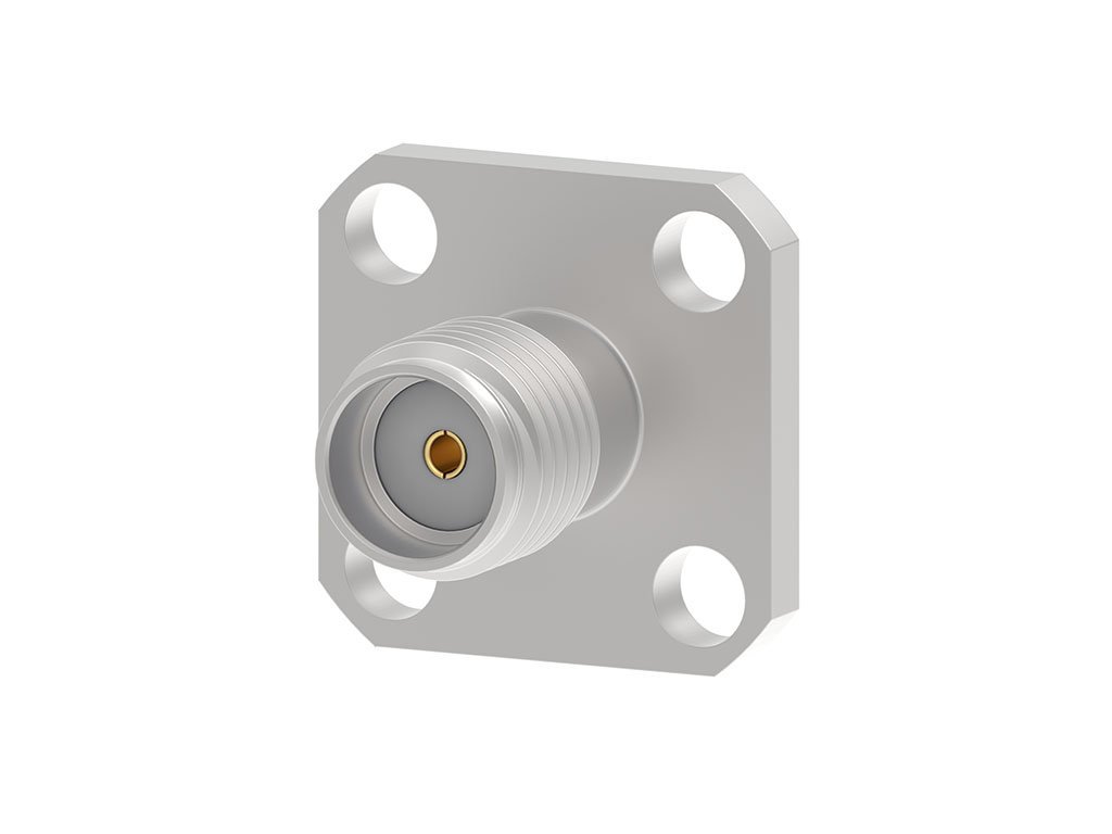 50 Ohms, SMA Jack, .500” x .500” Flange Mount, 4-Hole, Field Replaceable, Accepts .018″ Pin, EMI/RFI Ground Ring