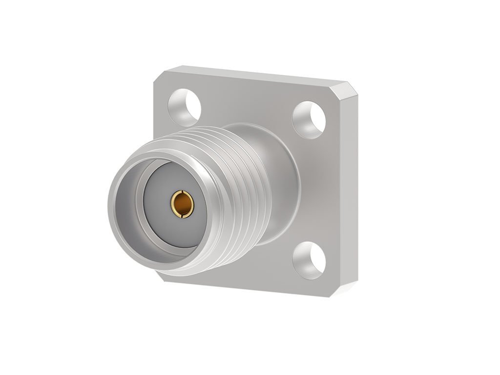 50 Ohms, SMA Jack, .375” x .375” Flange Mount, 4-Hole, Field Replaceable, Accepts .018″ Pin, EMI/RFI Ground Ring
