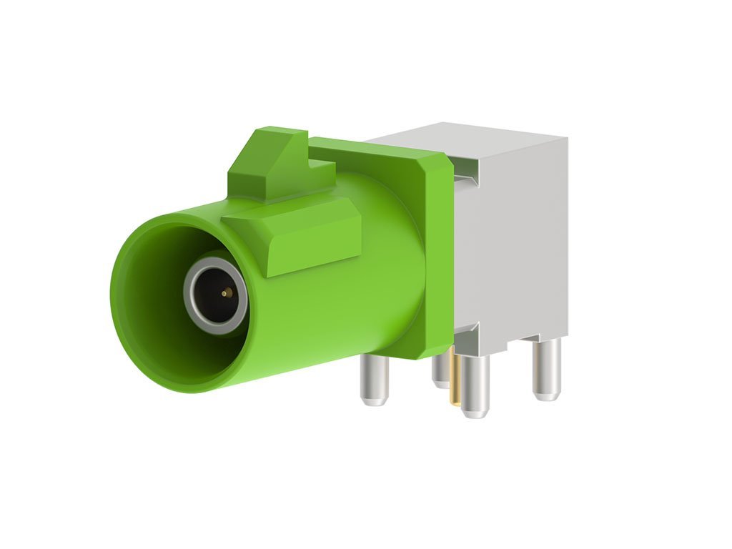 FAKRA Jack, Right-Angle, Through Hole, Key E, Die Cast, Tray, 50 Ohms