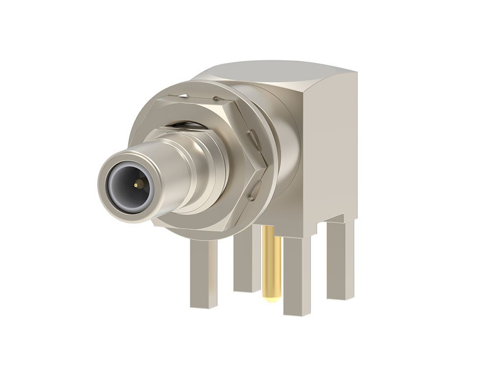 SMB Jack, Right-Angle, Through Hole, with Nut and Lockwasher, Tray, 50 Ohms