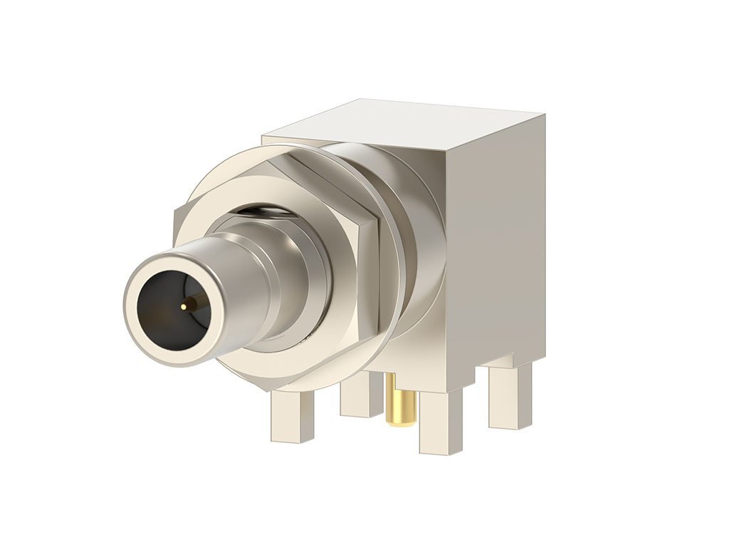 SMB Jack, Right-Angle, Through Hole, with Nut and Lockwasher, Tray, 50 Ohms