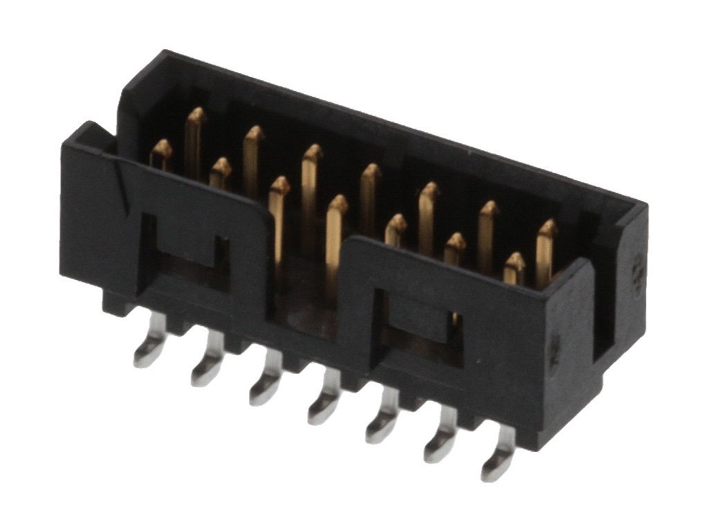 2.00mm Pitch, Milli-Grid PCB Header, Dual Row, Vertical, Surface Mount, Shrouded, Lead-Free, 14 Circuits, 0.38µm Gold (Au) Plating, with Locking Windows, with Center Polarization Slot, with Cap, without PCB Locator, Tape and Reel